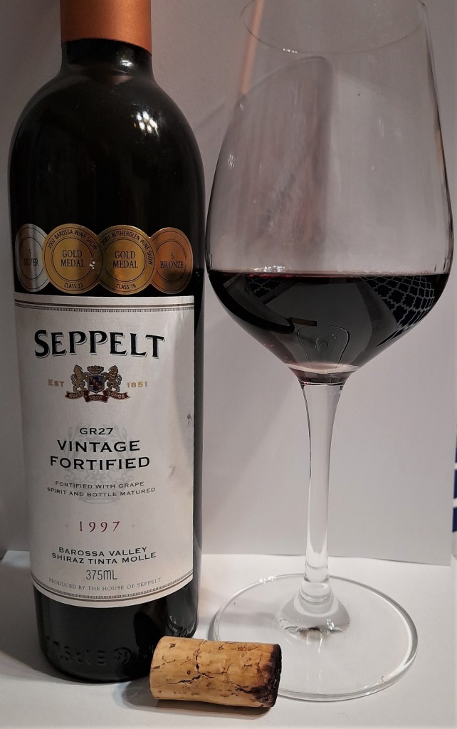 Barossa Valley (South Australia). Shiraz and Tinta molle.  Half-bottle with an abbreviated cork and abundant sediment. Decanting essential! Ruby colour with the beginning of some bricking. Rose-petal, sweet spices, sweet dark fruit and liquorice. The palate is soft, with the dark plum, blackberry and figgy fruit, mocha and brandy spirit in mellow harmony with a lingering spicy kick..